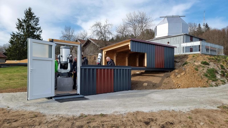 Pünktlich zum "Tag der Astronomie 2025" konnte die neue Sonnen-Sternwarte am 29. März 2025 von Landrat Franz Löffler feierlich eröffnet werden, in Anwesenheit des Stifter-Ehepaars von Deuster, Chameraus Bürgermeister Stefan Baumgartner und des MdL Dr. Gerhard Hopp. Wenn auch das Wetter die Beobachtung des astronomischen Groß-Ereignisses des Tages - der partiellen Sonnenfinsternis - nur für wenige Minuten zuließ, bewies das neuste Observatorium am Roßberg in den folgenden Monaten seinen Nutzen und der Besucherandrang übertraf alle Erwartungen.