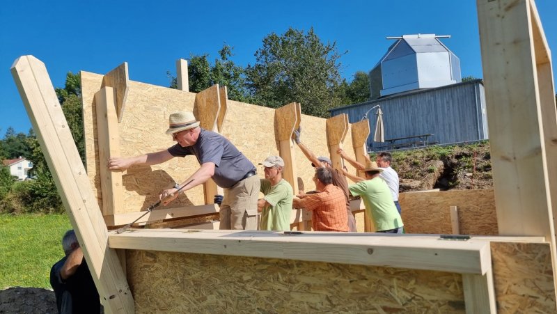 Richtfest - am 24. August 2024 werden die in einem Stadel in der Umgebung über Monate millimetergenau angefertigten Einzelbauteile - Wände, Schiebedach, Klappelement - zusammengefügt (Bild: Verein, 24.08.2024).