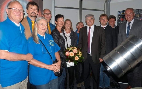 Eröffnung der Sternwarte Roßberg, v.l.: Dr. Eckart von Deuster (Hauptsponsor & Namensgeber), Martin Gammer (1. Vorsitzender), Uschi von Deuster (Hauptsponsorin), Stefan Graichen (Kassenwart), Isabella Bauer (LEADER-Managerin des Lkr. Cham), v.r.: Landrat Franz Löffler, Pfarrer Kilian Limbrunner, Bürgermeister Stefan Baumgartner, MdB Karl Holmeier (Bild: Chamer Zeitung vom 19. März 2016)